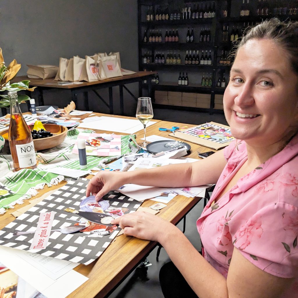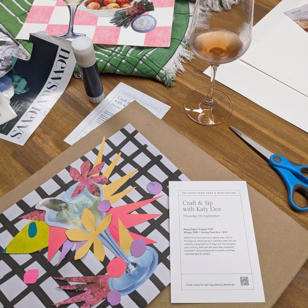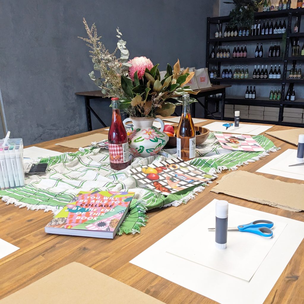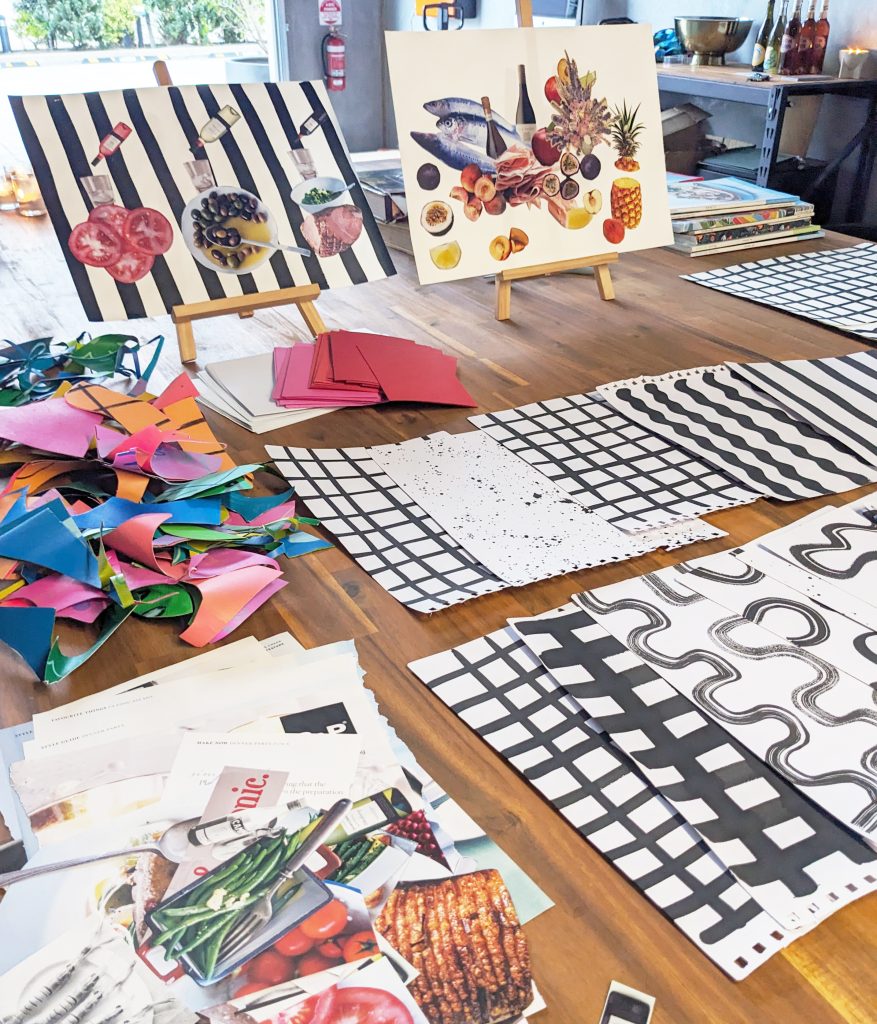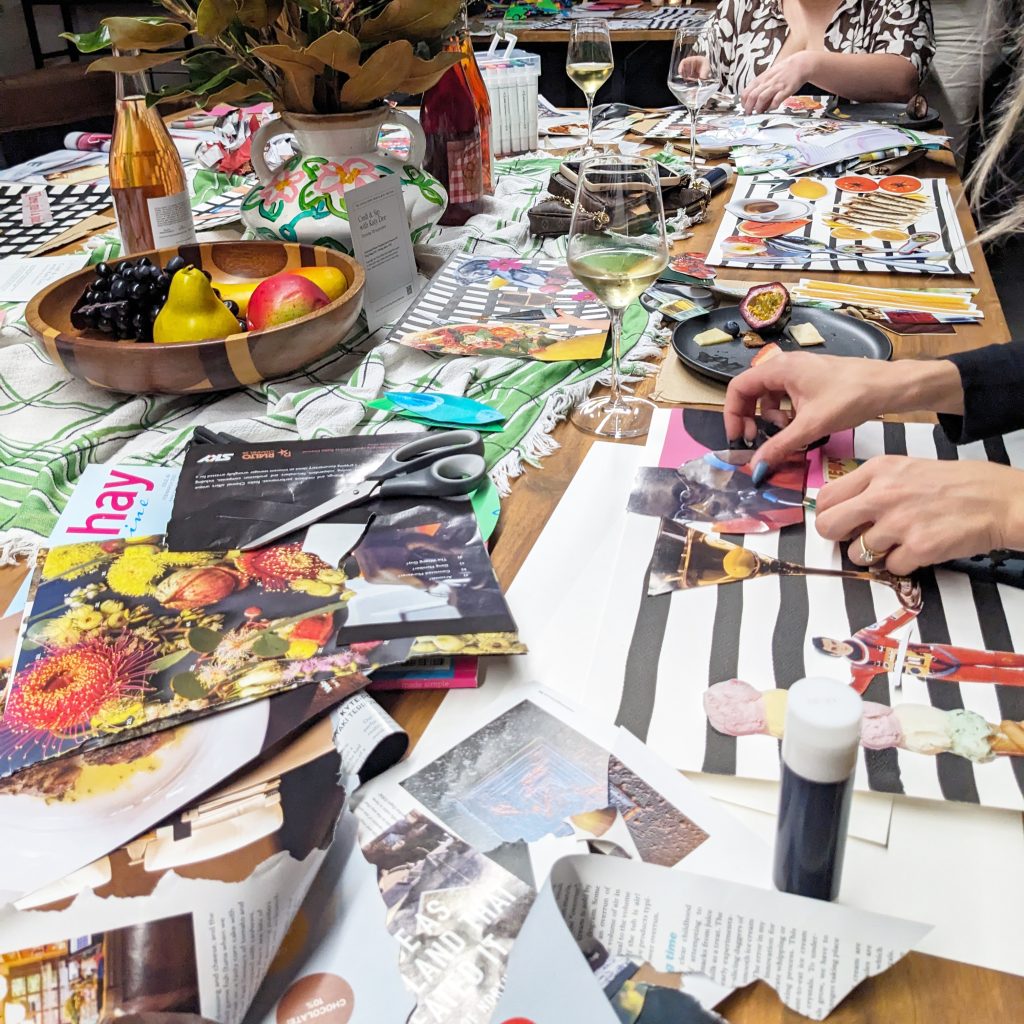 As part of the CCFWF I facilitated a craft n sip collage workshop at ‘The Vin’ where we also got to taste a selection of their beautiful wines. It was a small dedicated group and we had such a fun evening! We used old magazine and books to create fun collaged artworks, old school style. This still-life collage workshop was inspired by all things food & wine. Using still life from magazines and hand-painted papers, we pieced together a masterpiece – with a glass of vino in hand.
