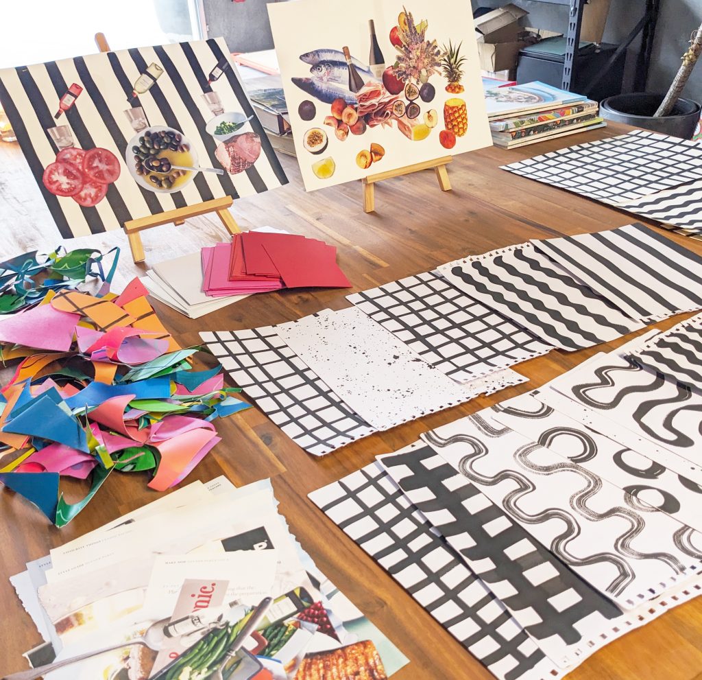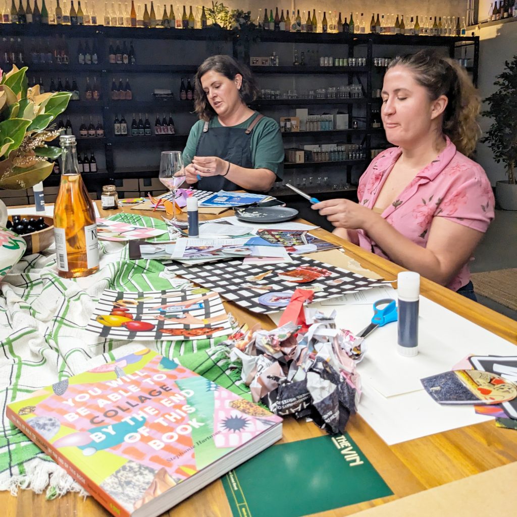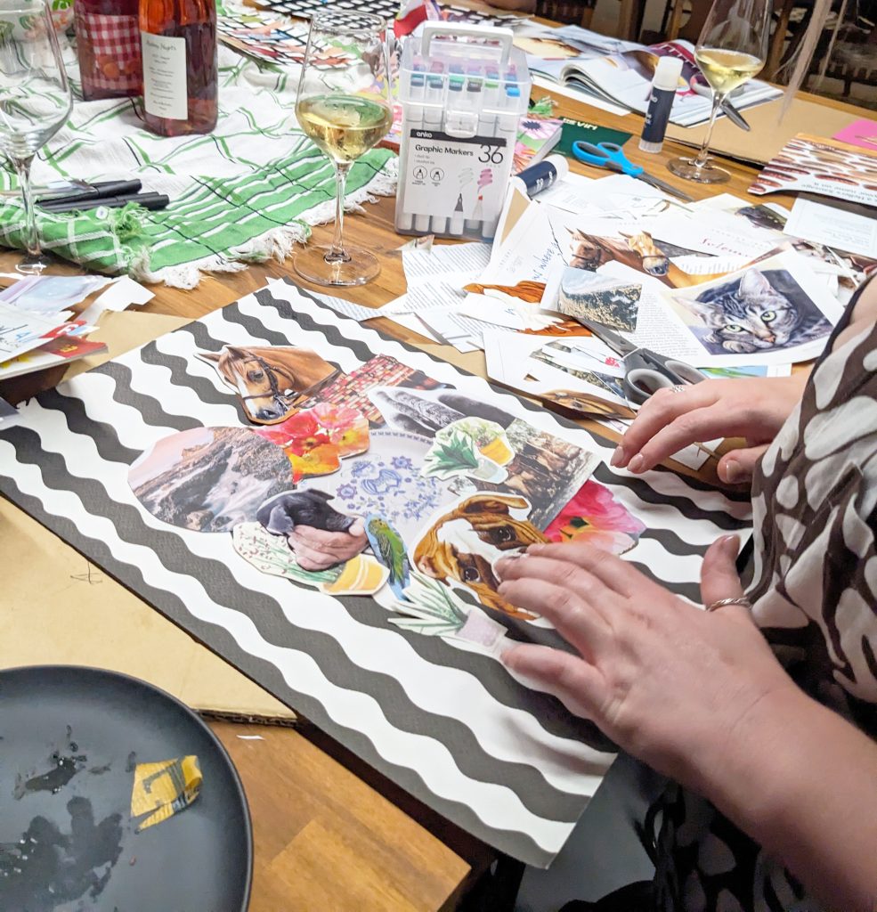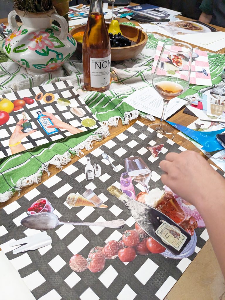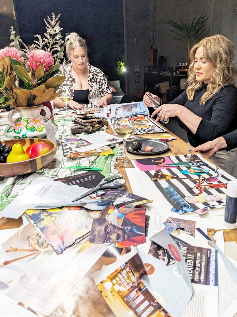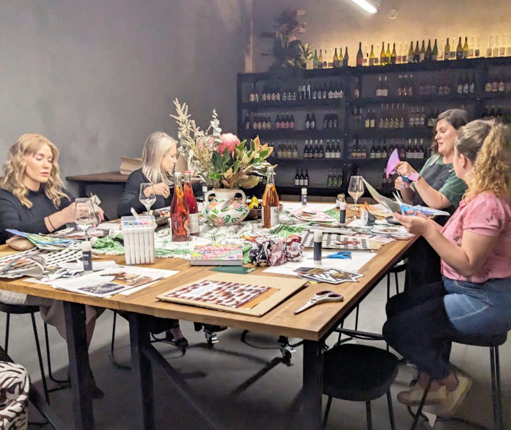 As part of the CCFWF I facilitated a craft n sip collage workshop at ‘The Vin’ where we also got to taste a selection of their beautiful wines. It was a small dedicated group and we had such a fun evening! We used old magazine and books to create fun collaged artworks, old school style. This still-life collage workshop was inspired by all things food & wine. Using still life from magazines and hand-painted papers, we pieced together a masterpiece – with a glass of vino in hand.
