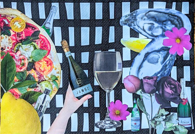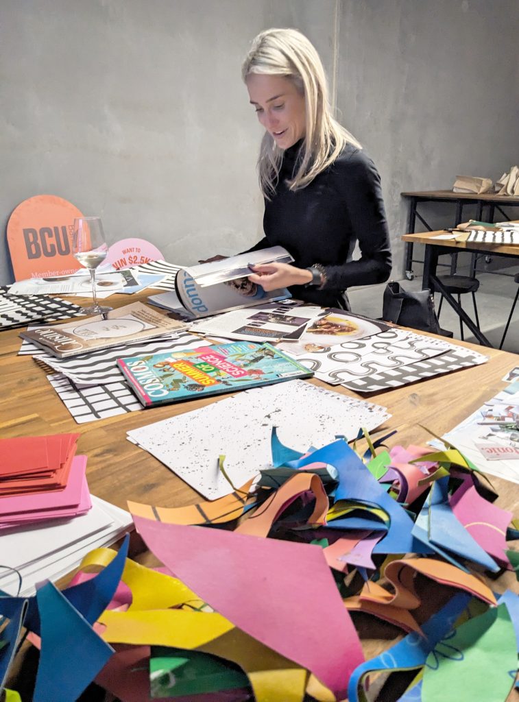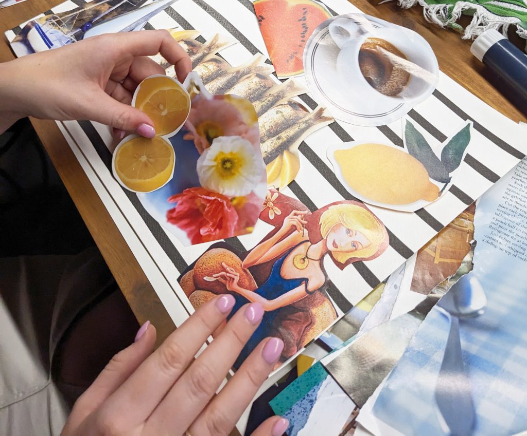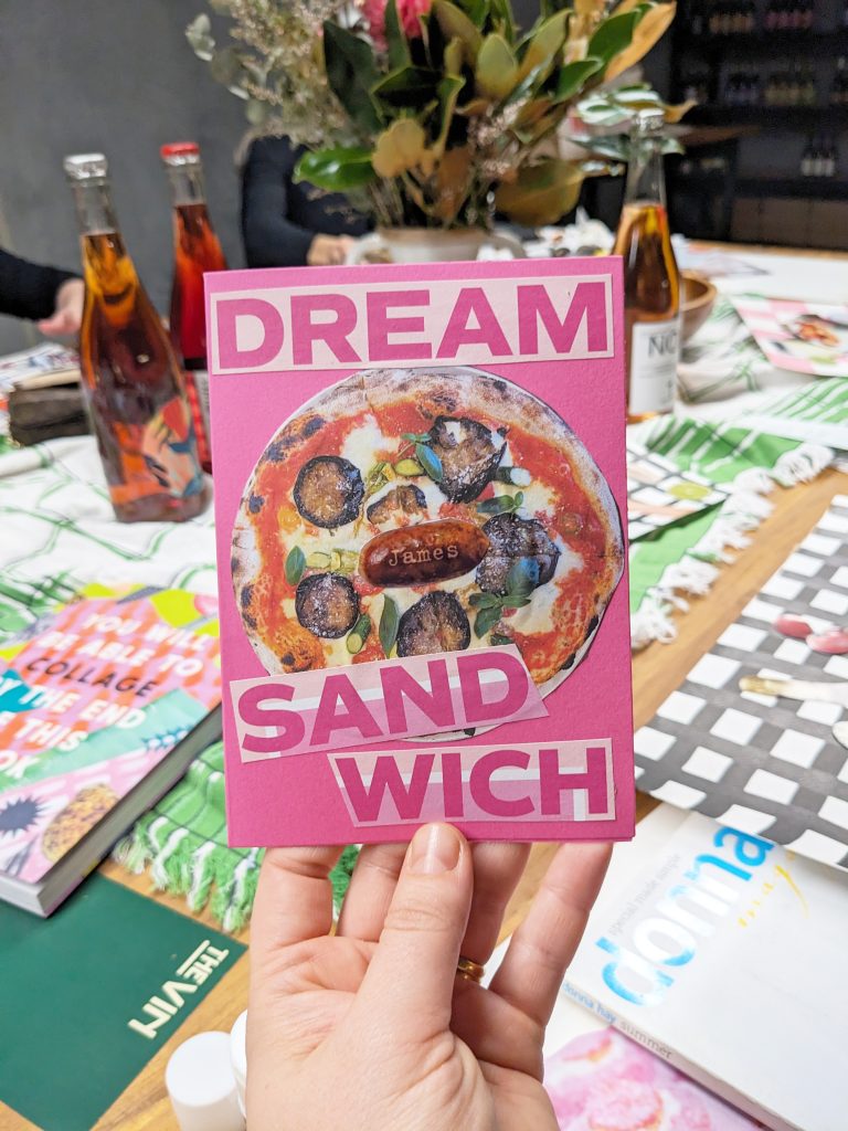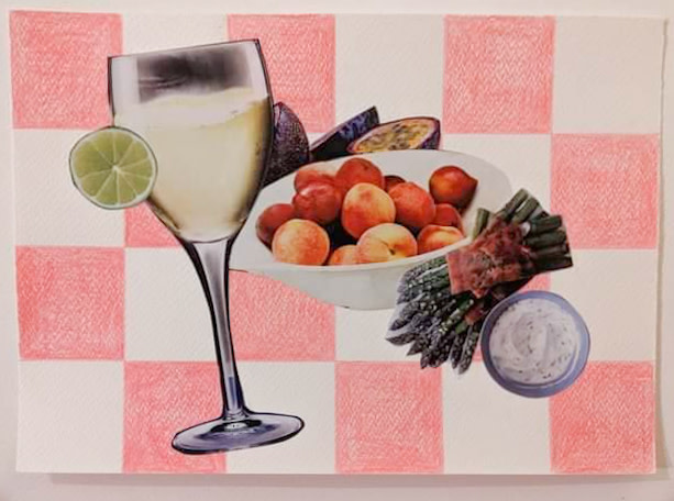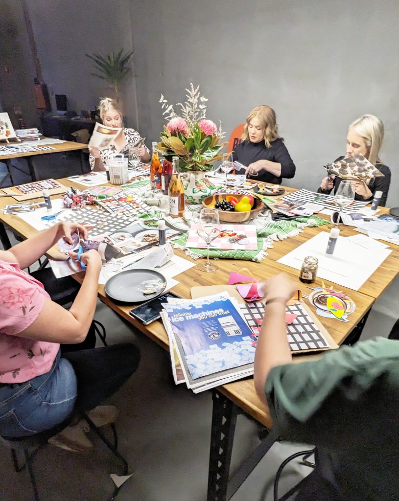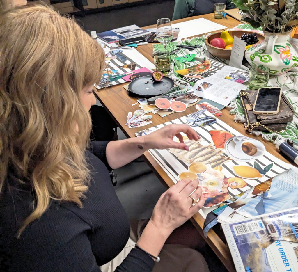 As part of the CCFWF I facilitated a craft n sip collage workshop at ‘The Vin’ where we also got to taste a selection of their beautiful wines. It was a small dedicated group and we had such a fun evening! We used old magazine and books to create fun collaged artworks, old school style. This still-life collage workshop was inspired by all things food & wine. Using still life from magazines and hand-painted papers, we pieced together a masterpiece – with a glass of vino in hand.